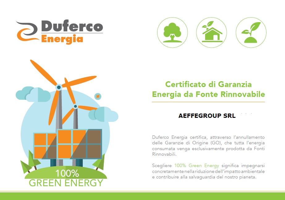 DUFERCO ENERGIA CERTIFICA, ATTRAVERSO L’ANNULLAMENTO DELLE GARANZIE D’ORIGINE(GO), CHE TUTTA L’ENERGIA CONSUMATA VENGA ESCLUSIVAMENTE PRODOTTA DA FONTI RINNOVABILI. SCEGLIERE 100% GREEN ENERGY SIGNIFICA IMPEGNARSI CONCRETAMENTE NELLA RIDUZIONE DELL’IMPATTO AMBIENTALE E CONTRIBUIRE NELLA SALVAGUARDIA DEL NOSTRO PIANETA.